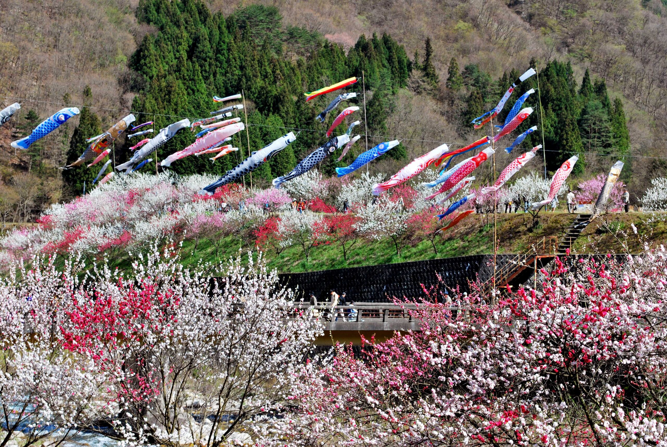 主要有三個區域可以欣賞:適合漫步賞花的「月川溫泉鄉」、「昼神溫泉鄉」。,還有合邊開車兜風邊賞花的長40km的國道256號線沿途「桃花街道」(はなもも街道)。此外,桃花花期也適逢日本每年5月5日的兒童節,在「月川溫泉鄉」中可以看到懸掛的巨大鯉魚旗,和盛開的桃花相互映襯。